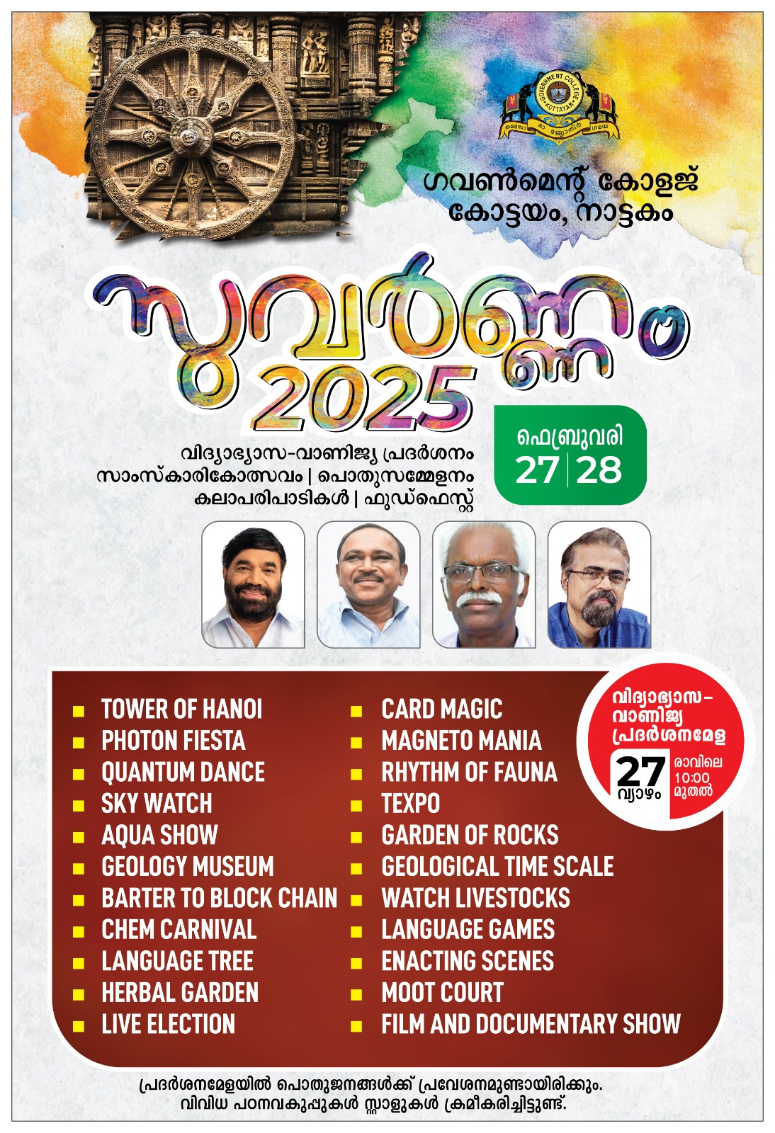 സുവർണ്ണം 2025 - വിദ്യാഭ്യാസ പ്രദർശന മേള, ഫെബ്രുവരി 27, 28 27 February 2025 / Comments Submitted by admin_gckottayam on 27 February 2025 Valedictory events of the Golden Jubilee Celebration of the College